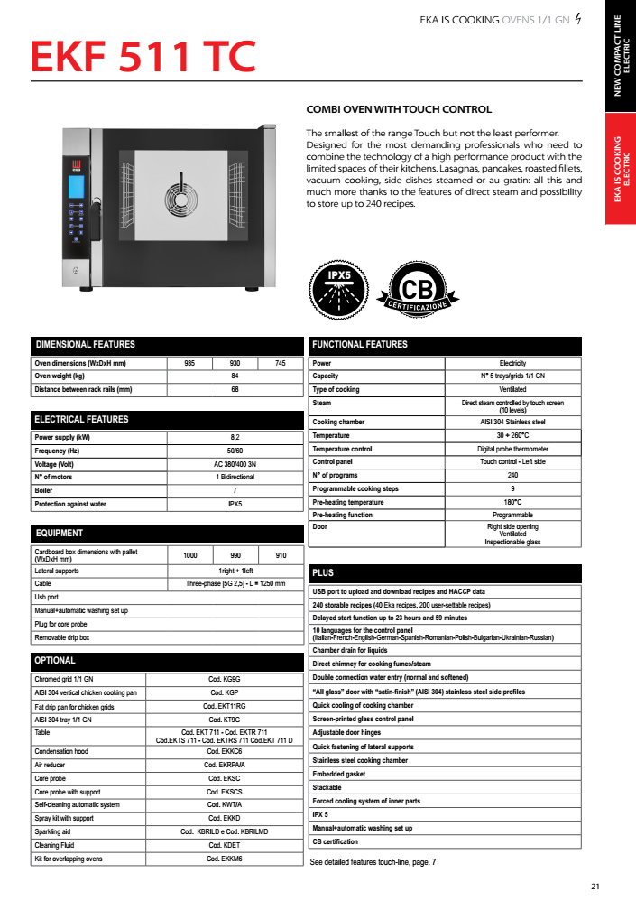 EKF-511-TC là loại nhỏ nhất trong phạm vi Touch nhưng không hiệu suất thấp nhất. Được thiết kế cho các chuyên gia khó tính nhất, những người cần kết hợp công nghệ của một sản phẩm hiệu suất cao với không gian hạn chế trong nhà bếp của họ. Lasagne, crepes, rang xay, philê, nấu chân không, hấp hoặc au gratin món ăn phụ: tất cả điều này và nhiều hơn nữa nhờ các chức năng hơi trực tiếp và khả năng lưu trữ lên đến 240 công thức nấu ăn.